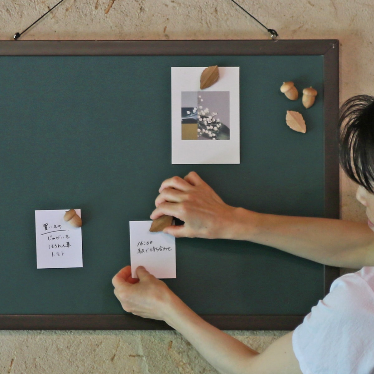 このどんぐりマグネットは、私たちが敷地内の森の整備を行い、その過程で伐採した木を使用しています。