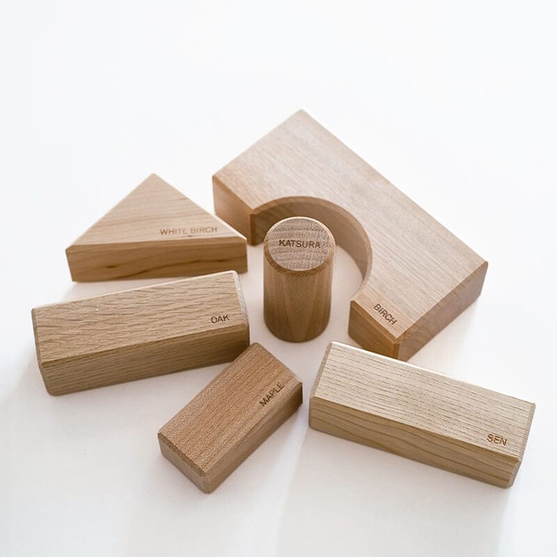 「寄木の積木」は、12種類以上の日本の木を使用しています。小さな子どもの手にも堅さや重さの実感がちょうど良く、それぞれの個性までも感じて発見できるような積木となるよう、何十種類とある木の中から、多彩で適材適所の選材を行っています。