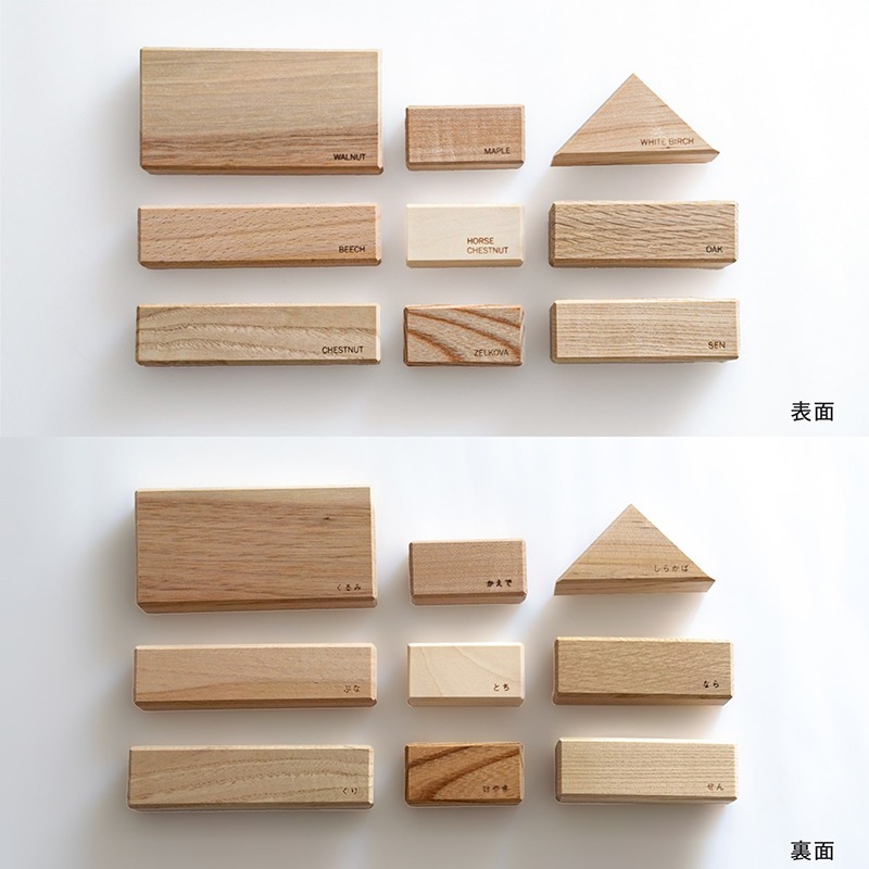 それぞれのピースには英語と日本語で樹種名が焼印した、オークヴィレッジの人気商品「寄木の積木」の英語版です。(表面に英語、裏面に日本語にて樹種が刻印されています。) OAKは「なら」、ZELKOVAは「けやき」…、と遊びながら英語の勉強にもつながります。