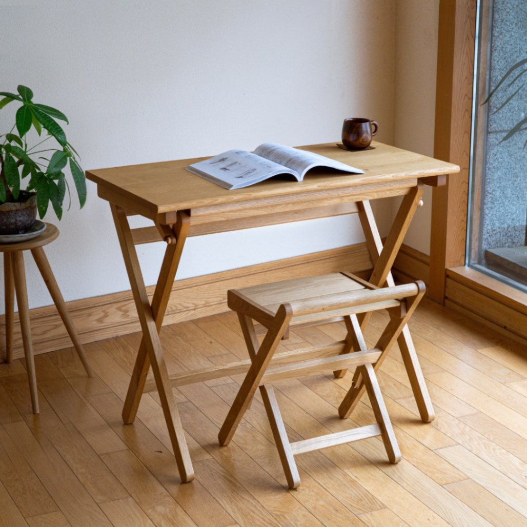 オーダーテーブル等と変わらないオークヴィレッジの家具造りのノウハウがしっかりと組み込まれた、折りたたみ式のデスクとスツールのセットです。
