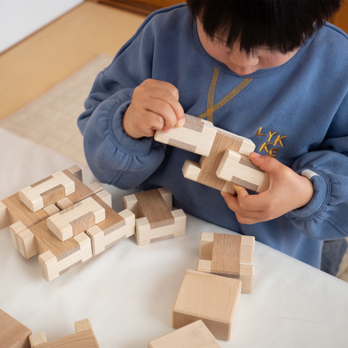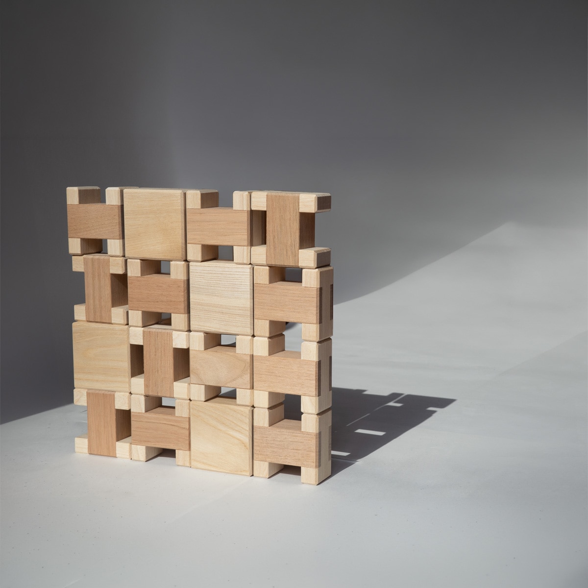 はじめはバランスを取って積む遊びから、縦横にきっちり積んだり、光や影を楽しんだり。やがて組み合わせや造形遊びへと、成長とともに遊びの幅が自然に広がっていきます。