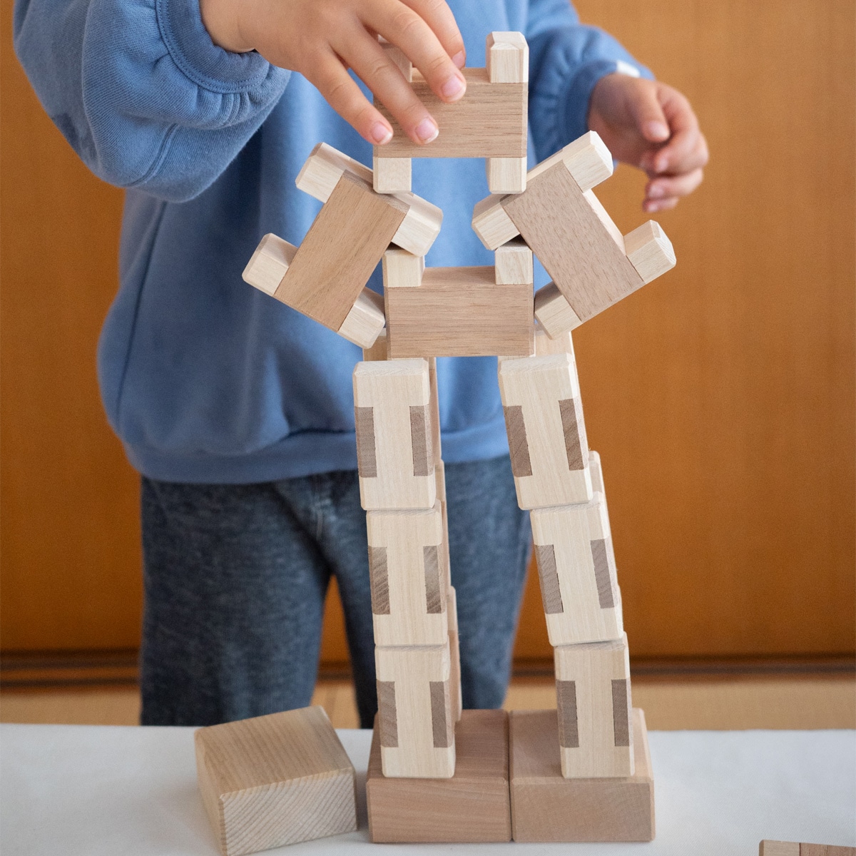 シンプルなH型のピースを用いてさまざまな造形を楽しめる木のおもちゃ。