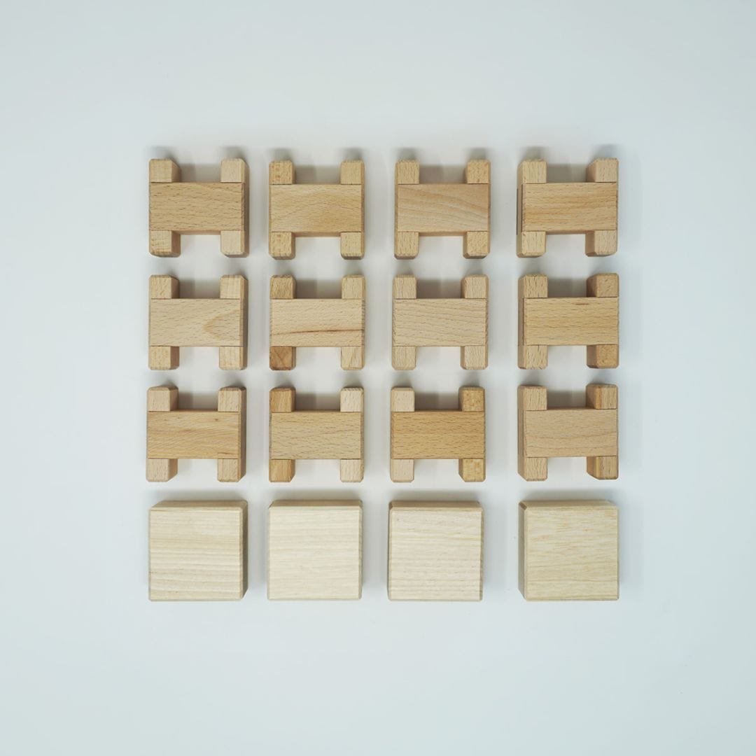 H型ピース12個と四角ピース4個のセット。組み合わせ次第で、さまざまな形や構造を発見でき、想像力を存分に発揮できます。